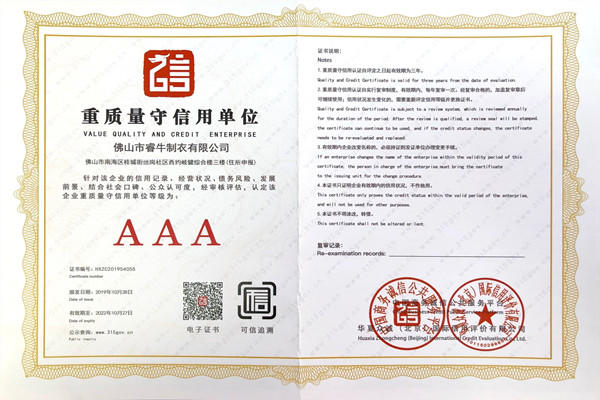 佛山市睿牛制衣有限公司——3A級(jí)重服務(wù)守信用企業(yè);