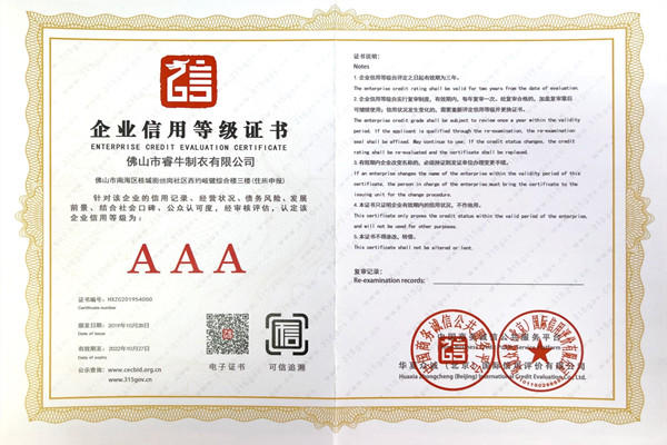 佛山市睿牛制衣有限公司——3A級(jí)企業(yè)信用等級(jí)證書(shū);