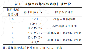 靜態防水性能是指沖鋒衣抵御雨水浸濕滲透的能力。這是沖鋒衣最基礎的功能,可以有效防止雨雪浸入衣服。這一項可以通過量化實驗檢查——對織物一面施加一個持續上升的水柱,直到另一面出現三處滲水點,此時去水柱水壓值??轨o水壓等級和防水性能評價表見下圖