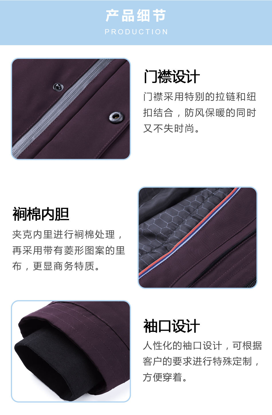 門襟設(shè)計:門襟采用特別的拉鏈和紐扣結(jié)合,防風(fēng)保暖的同時又不失時尚。