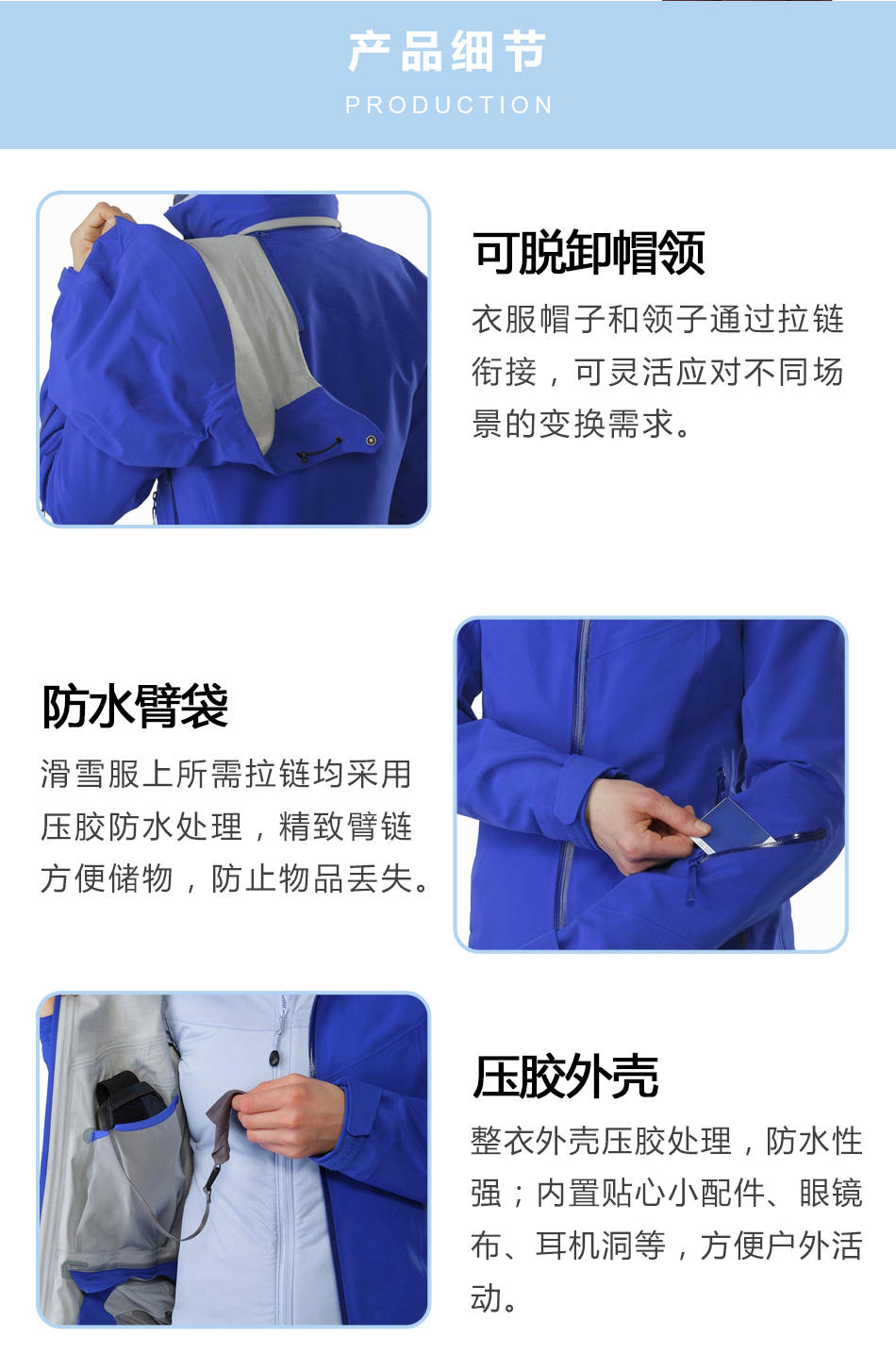 • 可脫卸帽領:衣服帽子和領子通過拉鏈銜接,可靈活應對不同場景的變換需求。