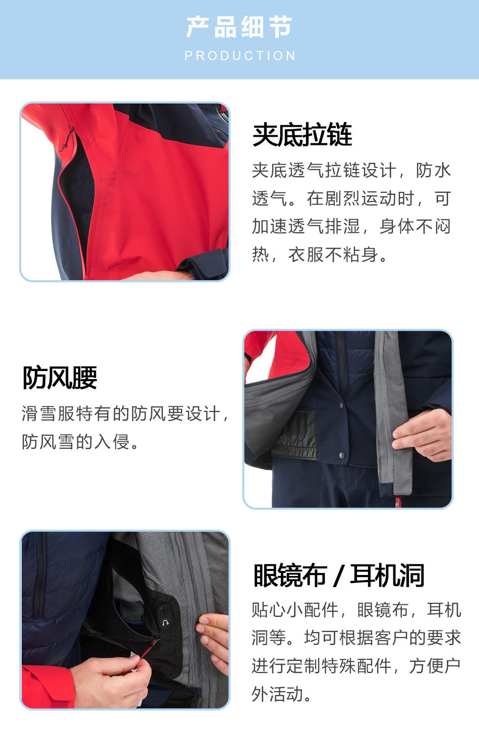防風(fēng)腰:壓膠滑雪服生產(chǎn)具特有的防風(fēng)要設(shè)計(jì),防風(fēng)雪的入侵。