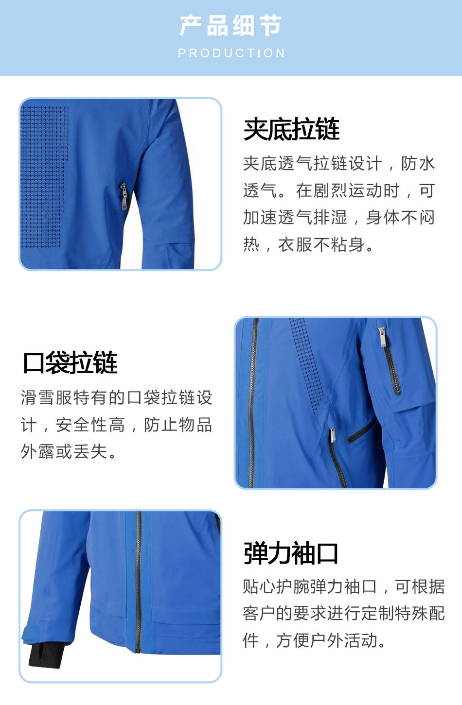 口袋拉鏈滑雪服生產特有的口袋拉鏈設計,安全性高,防止物品外露或丟失。